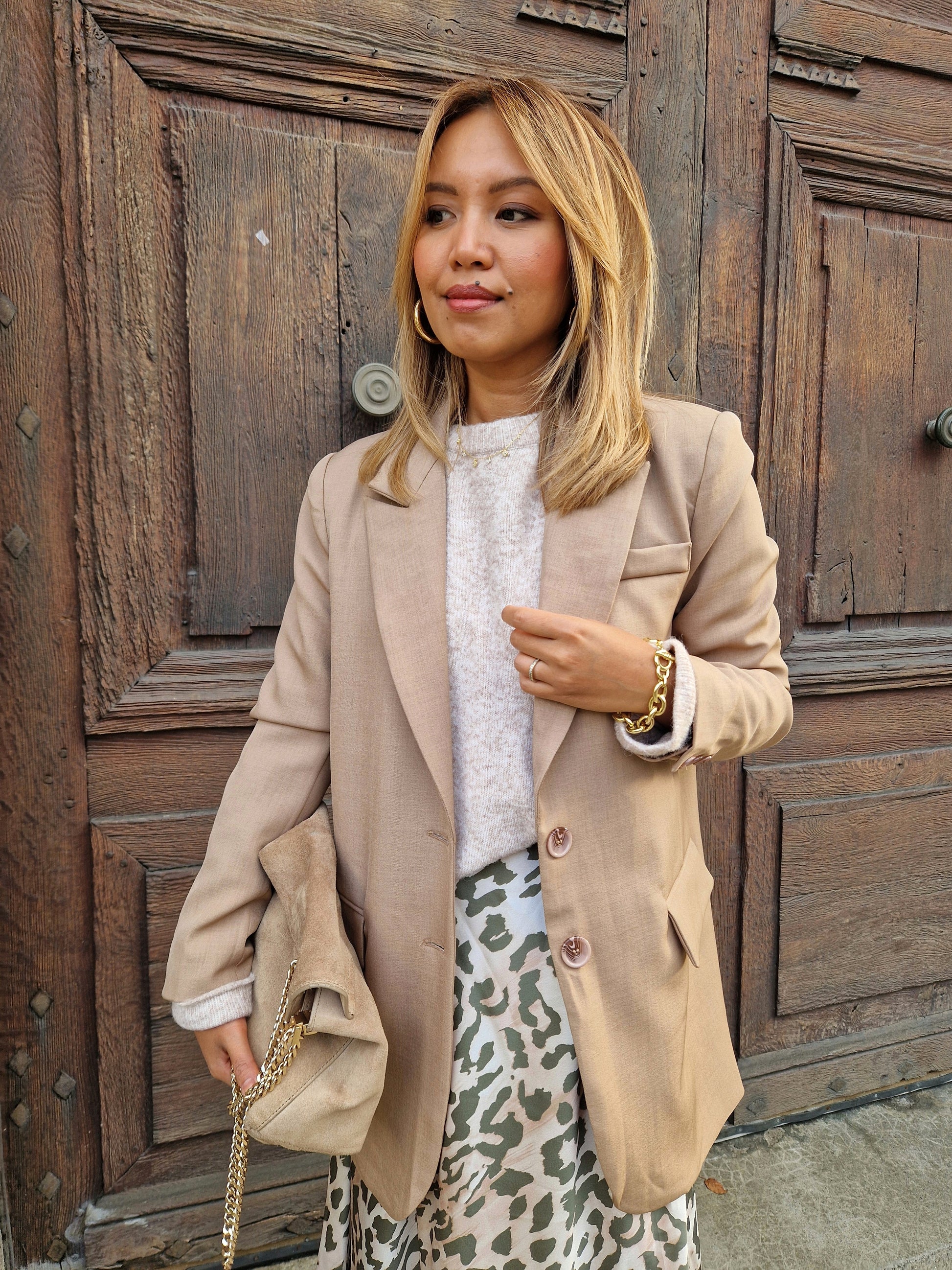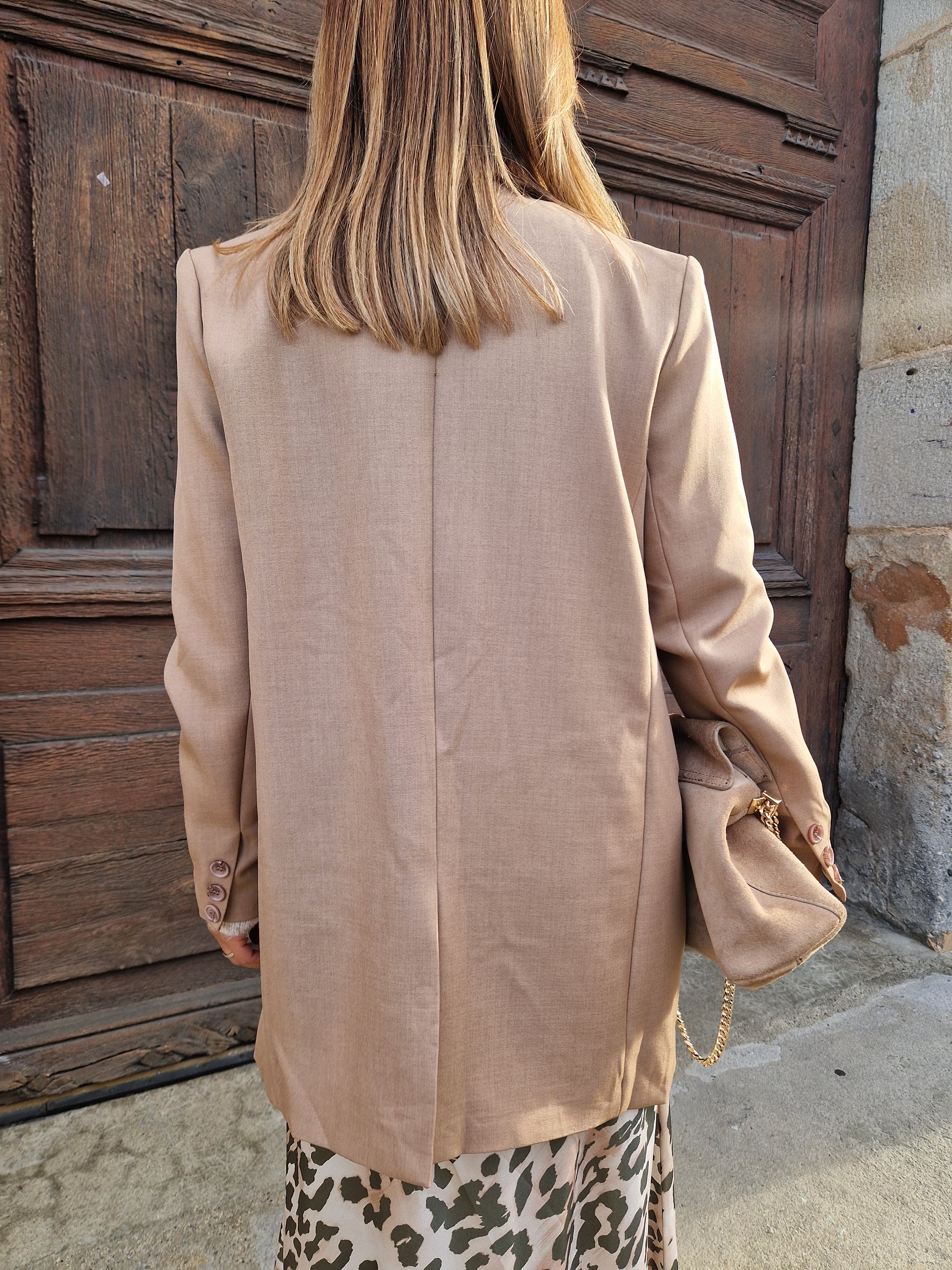 Ce blazer beige taupe séduit par sa coupe droite élégante et ses détails soignés. Doté de poches pratiques, il présente une ouverture d’aisance au dos pour plus de confort et des boutons décoratifs au niveau des manches qui complètent son style.