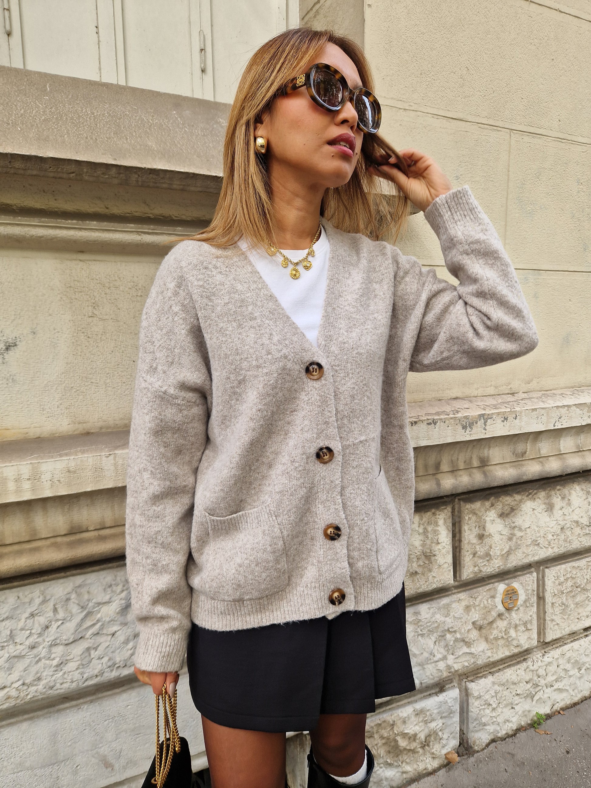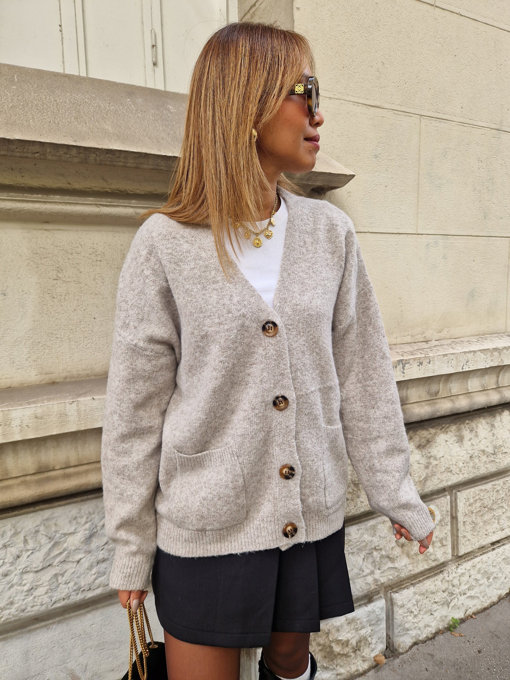 Ce gilet beige séduit par sa maille douce et sa coupe intemporelle. Doté de poches plaquées à l’avant et d’un col V, il se ferme par de jolis boutons effet écaille qui ajoutent une touche de caractère. Il allie confort et style pour accompagner vos looks du quotidien.