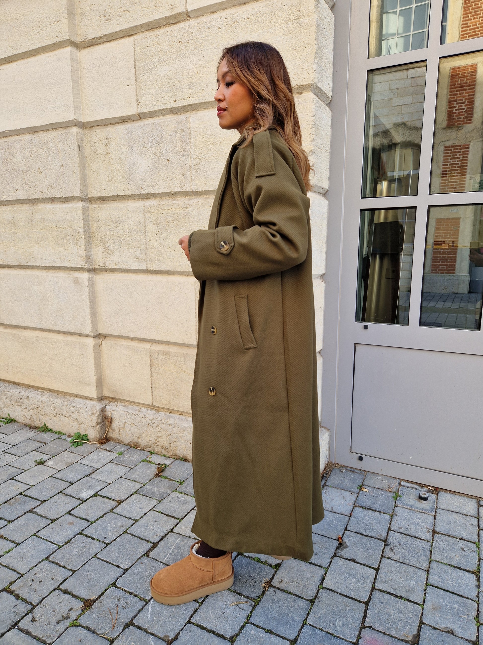 Ce manteau droit très long en vert kaki se distingue par son tombé fluide et élégant. Sa coupe élancée allonge la silhouette, tandis que les sangles aux épaules et sur les manches apportent un détail travaillé qui lui donne du caractère. Léger mais couvrant, il se porte facilement du matin au soir, seul ou superposé, pour composer des looks tendance en toute saison.