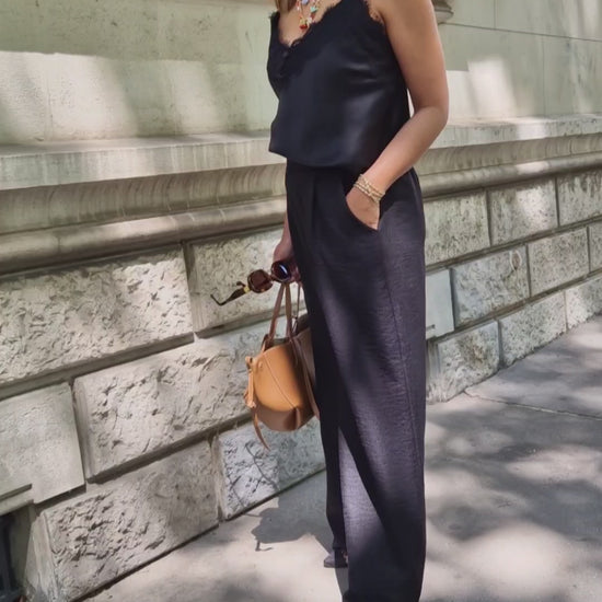 Un pantalon fluide et confortable, pensé pour un look à la fois décontracté et soigné. Sa coupe large et ses pinces à l’avant structurent la silhouette tout en gardant une belle aisance. La taille élastique au dos s’adapte en douceur, et les poches ajoutent la touche pratique qu’on aime.
