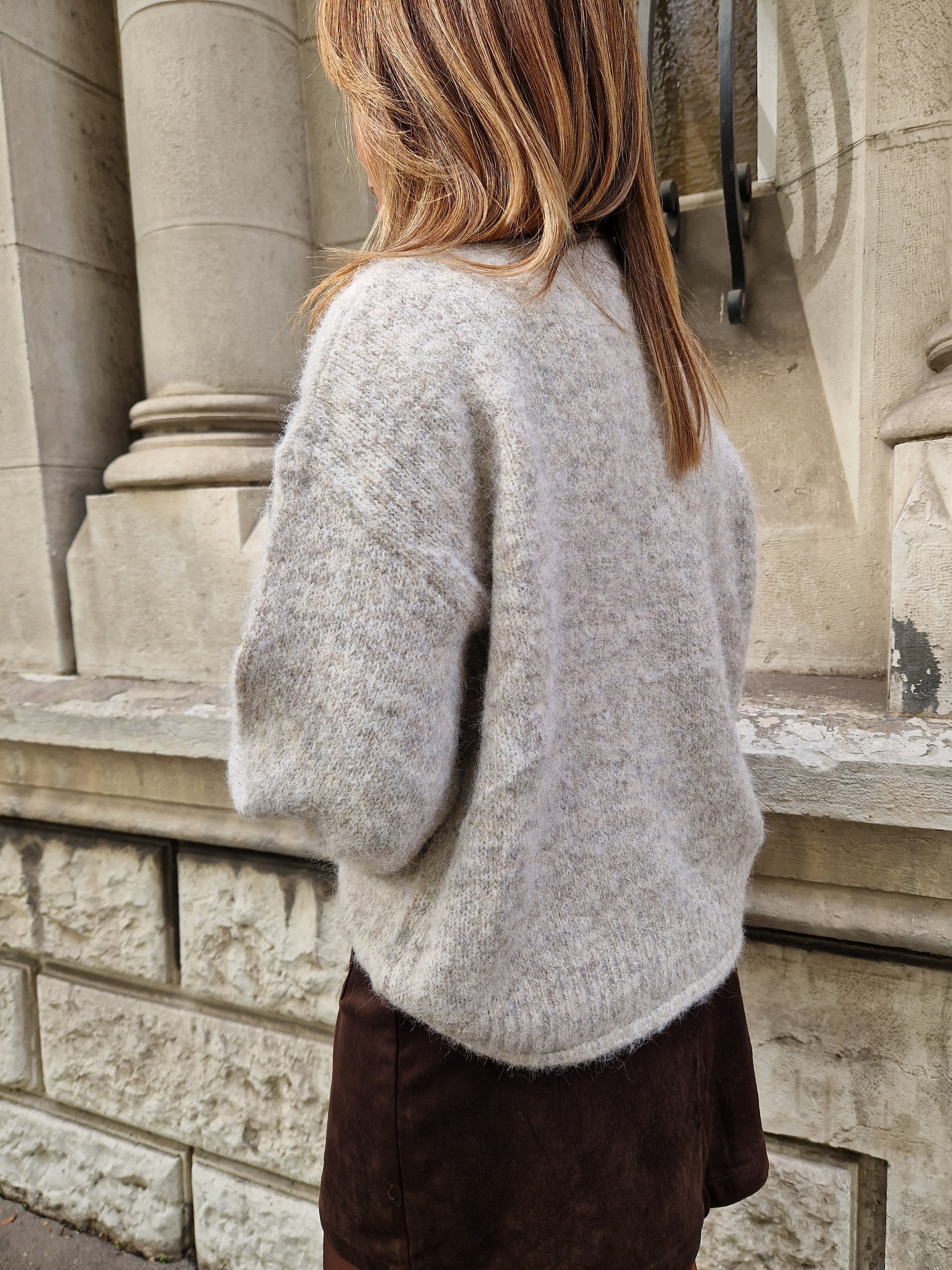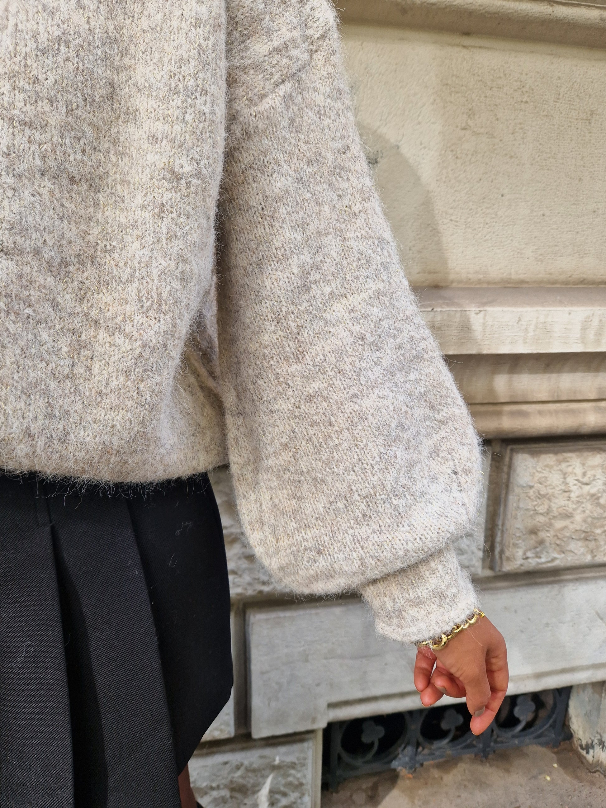 Chic sans effort, ce pull beige chiné joue la carte de la douceur avec son col légèrement montant et ses manches bouffantes au poignet. Un fil doré discret se glisse dans la maille et apporte une touche lumineuse subtile, parfaite pour réchauffer les looks du quotidien. Taille unique, il convient du 36 au 40.