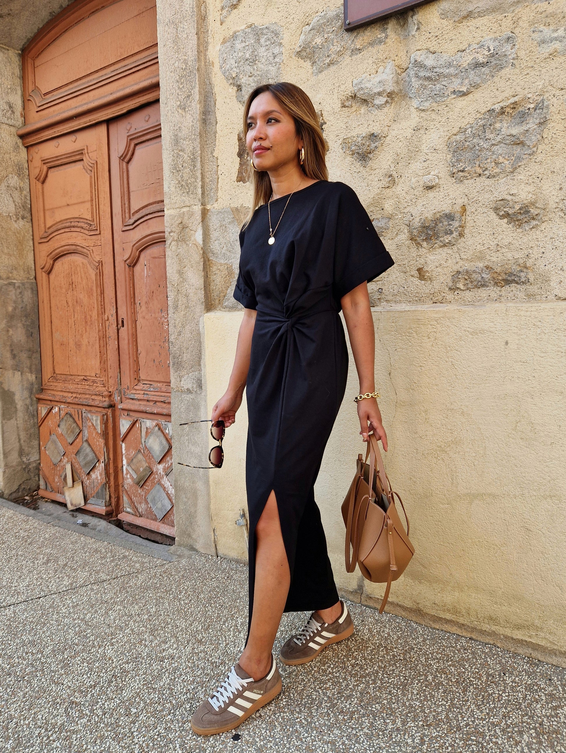 Une allure décontractée mais toujours soignée avec cette robe longue noire, en coton façon sweat léger.