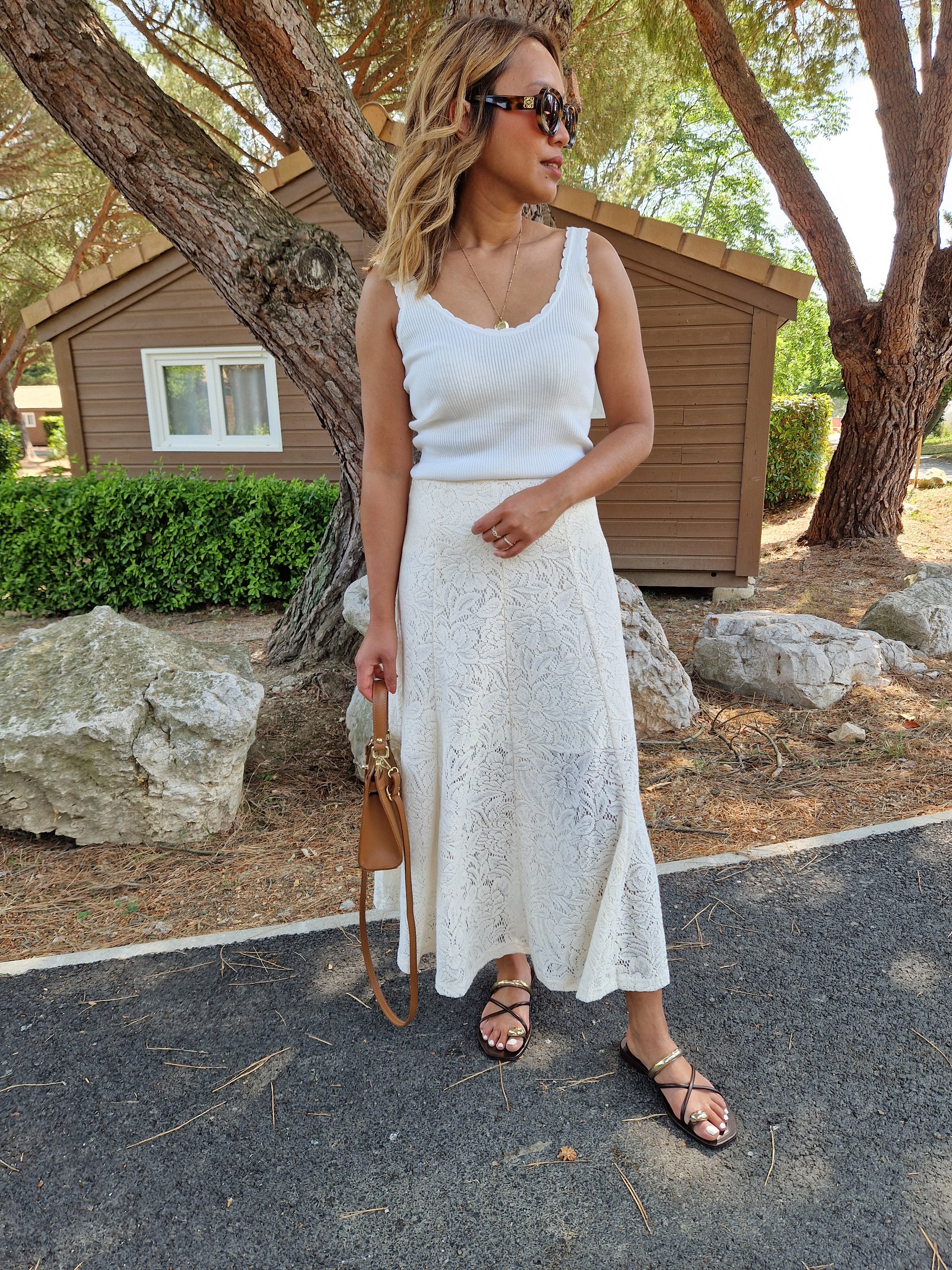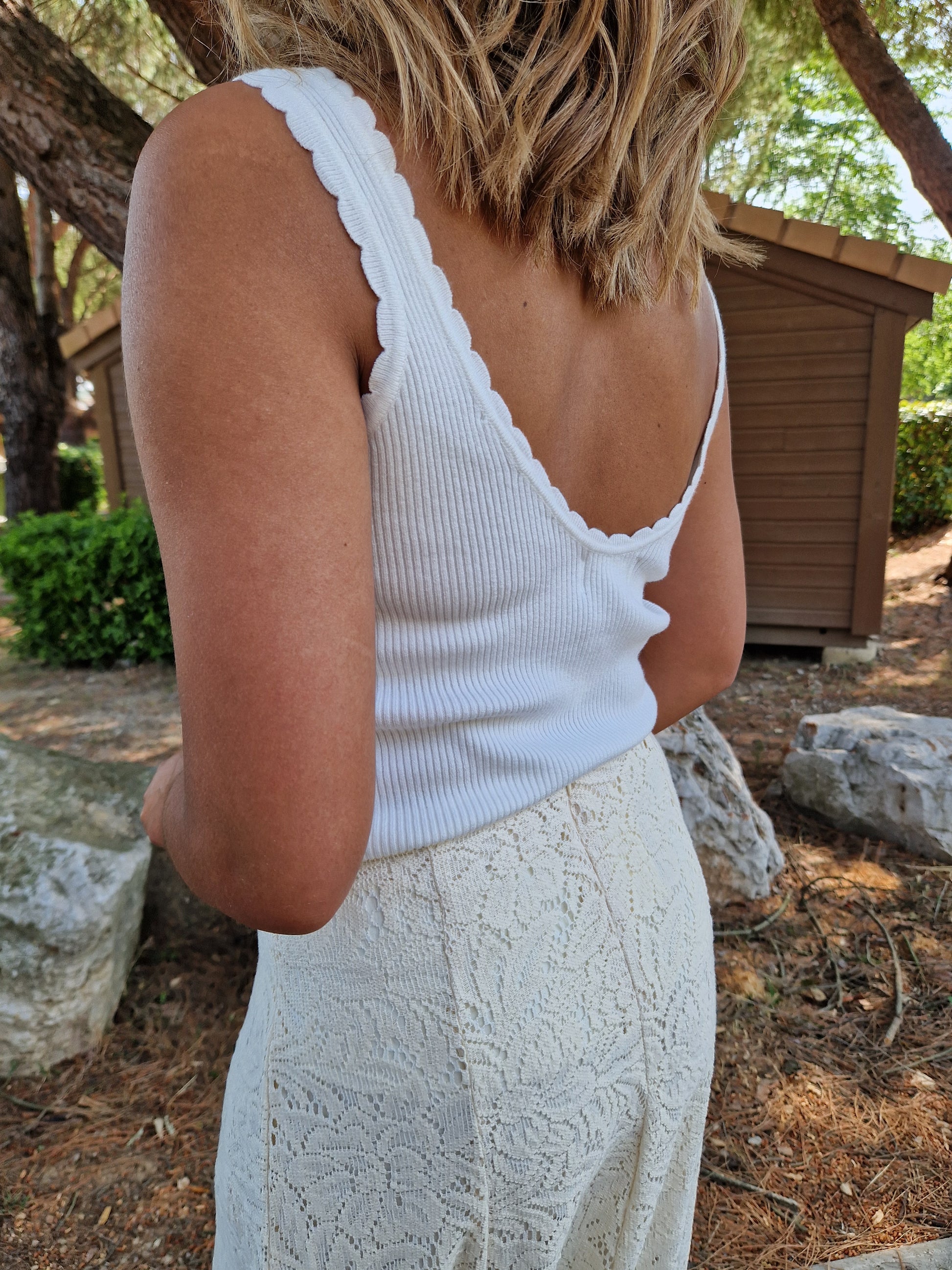 Top blanc en maille côtelée fine — coupe ajustée et stretch. Taille unique, convient du 34 au 40.