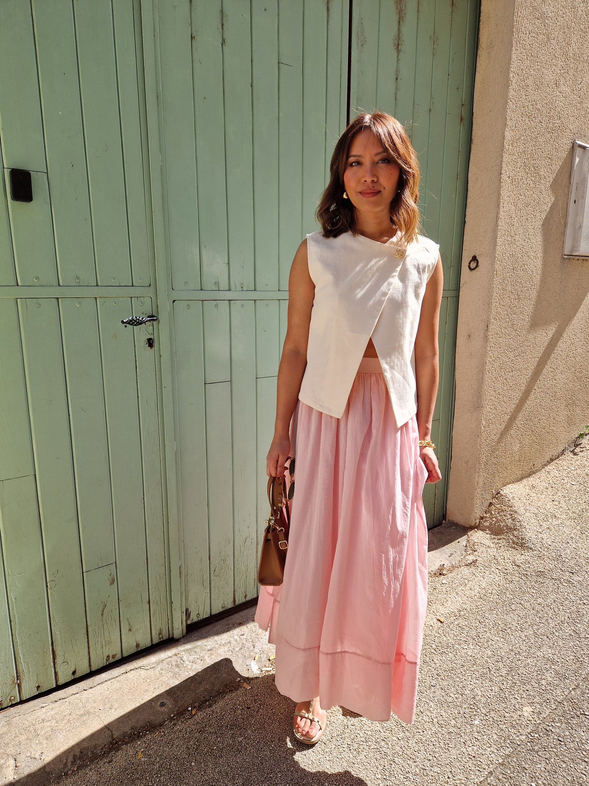 Top sans manches écru à la coupe travaillée, marqué par un devant asymétrique qui structure joliment la silhouette. La fermeture par bouton doré apporte une touche lumineuse et souligne le détail du croisé. Sa matière naturelle mêlant coton et lin offre un tombé souple et agréable à porter, parfait pour les journées ensoleillées ou les superpositions plus habillées.