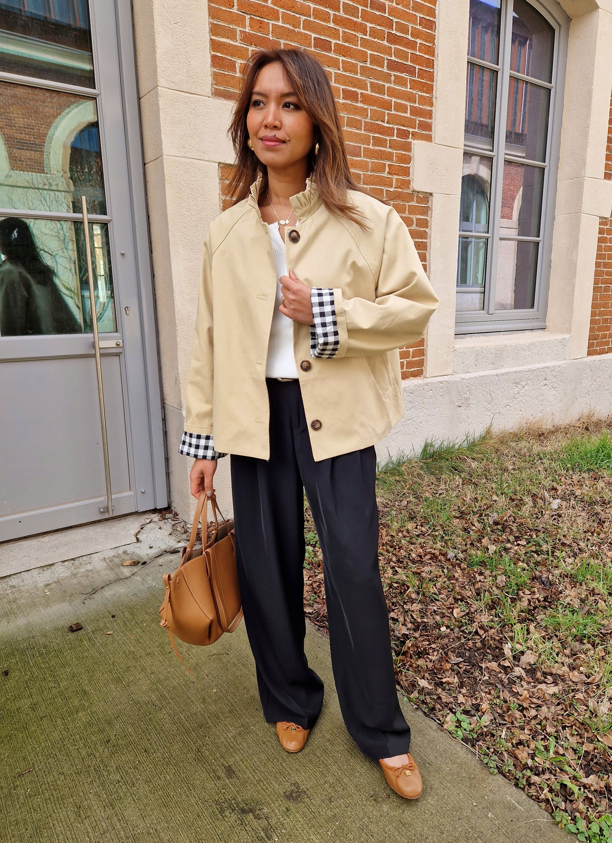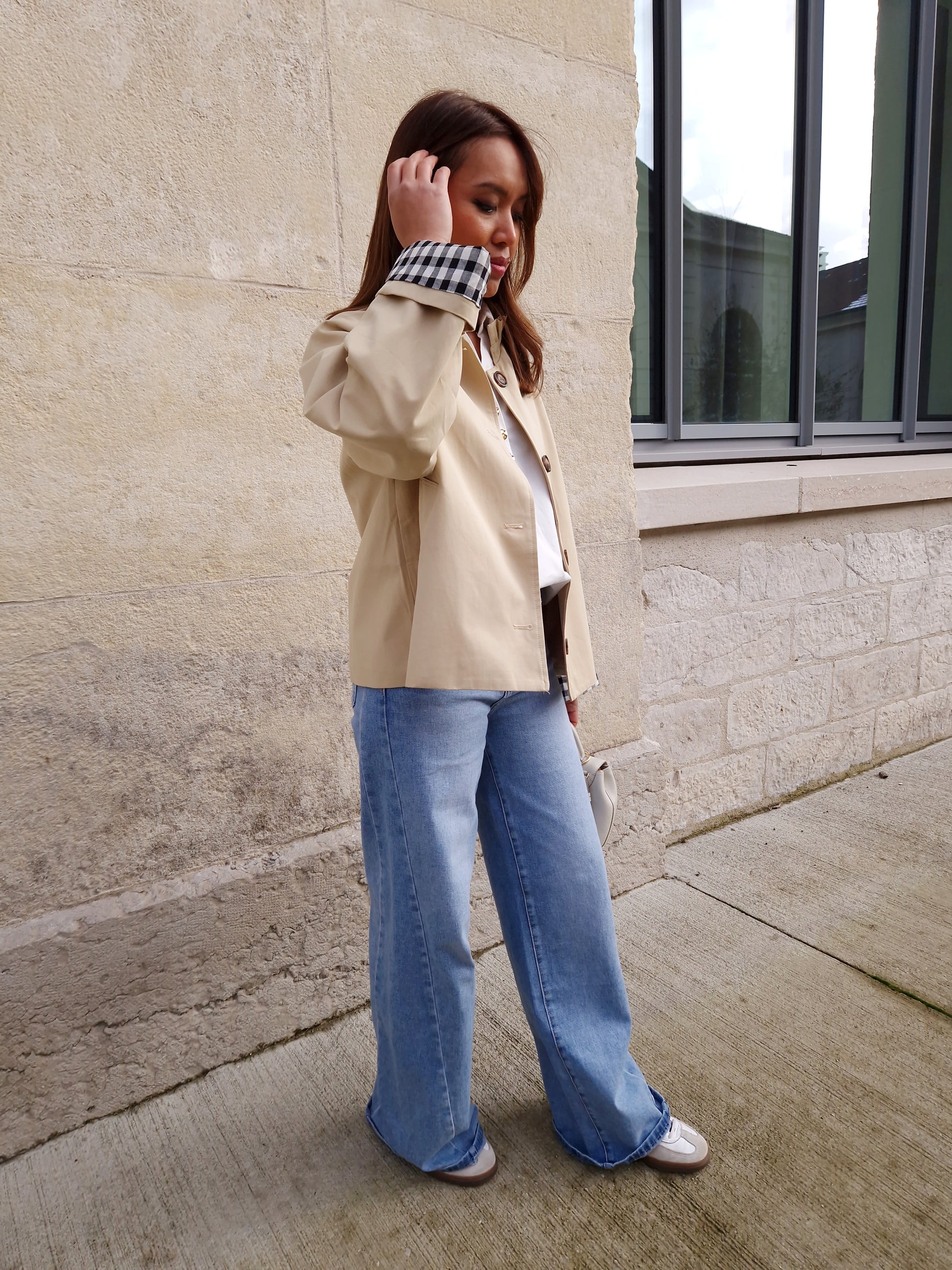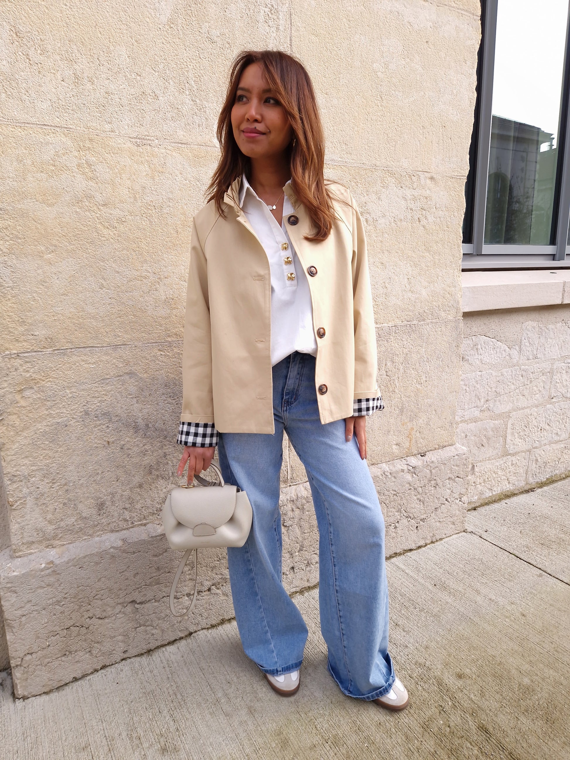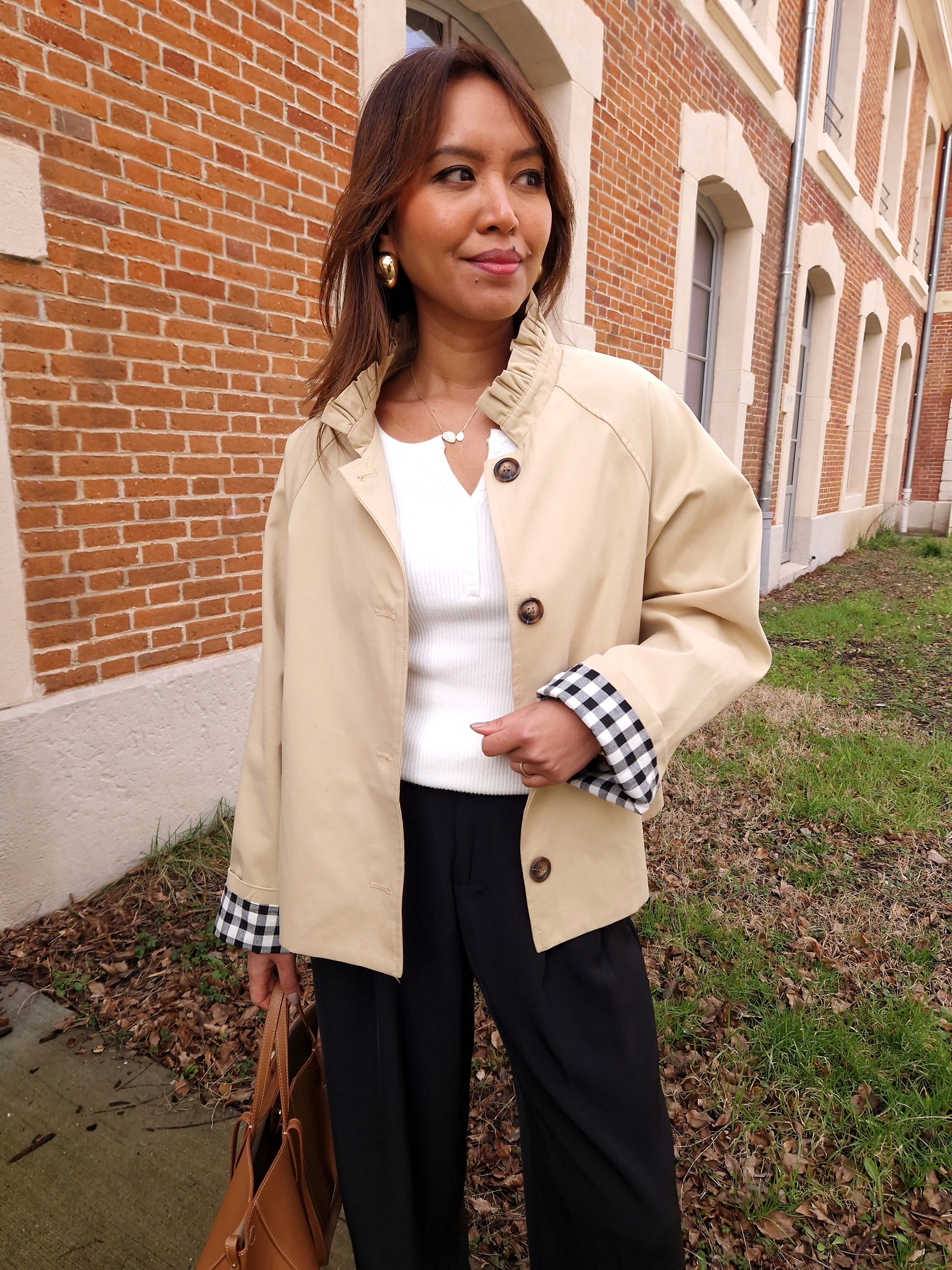 Trench court beige en coton, à l’allure élégante et pleine de détails. Son col montant est sublimé par un volant plissé qui apporte du relief et une vraie singularité au modèle. Les manches sont doublées d’un motif vichy, discrètement visible lorsqu’elles sont retroussées, pour une touche graphique et raffinée.
